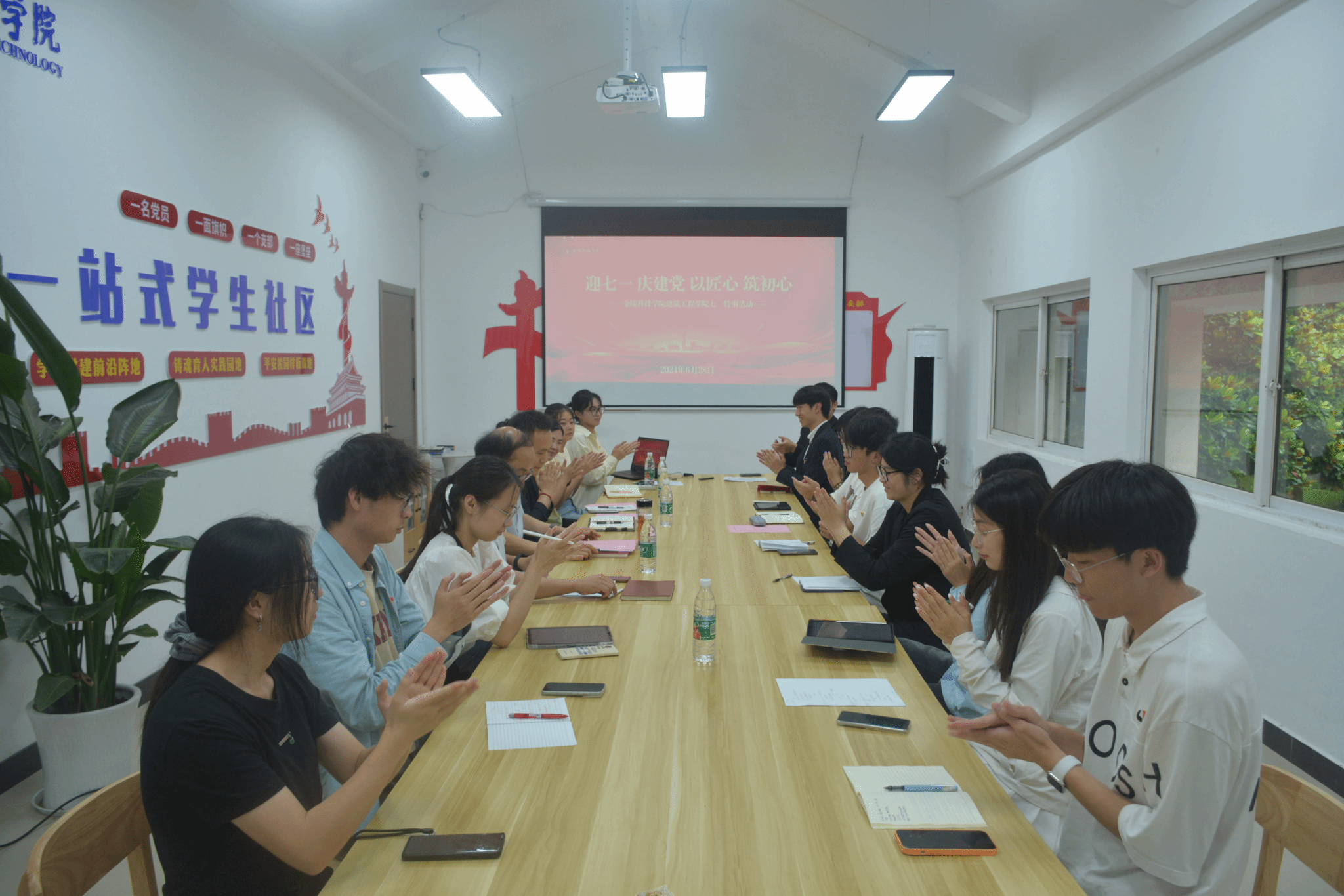 为了迎接七月一日建党节的到来,杨如丽书记带领师生重温习近平总书记在庆祝中国共产党成立100周年大会上的讲话,阐述中国共产党百年以来的历史成就和伟大目标。郑庆秋副书记,回溯党史,追忆中国共产党的光辉历程,并着重强调大学生要在社会实践中磨砺专业知识,坚定理想信念。在随后的“践匠心”交流分享环节中,研究生和本科生暑期社会实践团队代表分别围绕爱国主义教育、科技创新、文化传承等时代主旋律,分享了团队的选题背景、实践规划和预期成果。