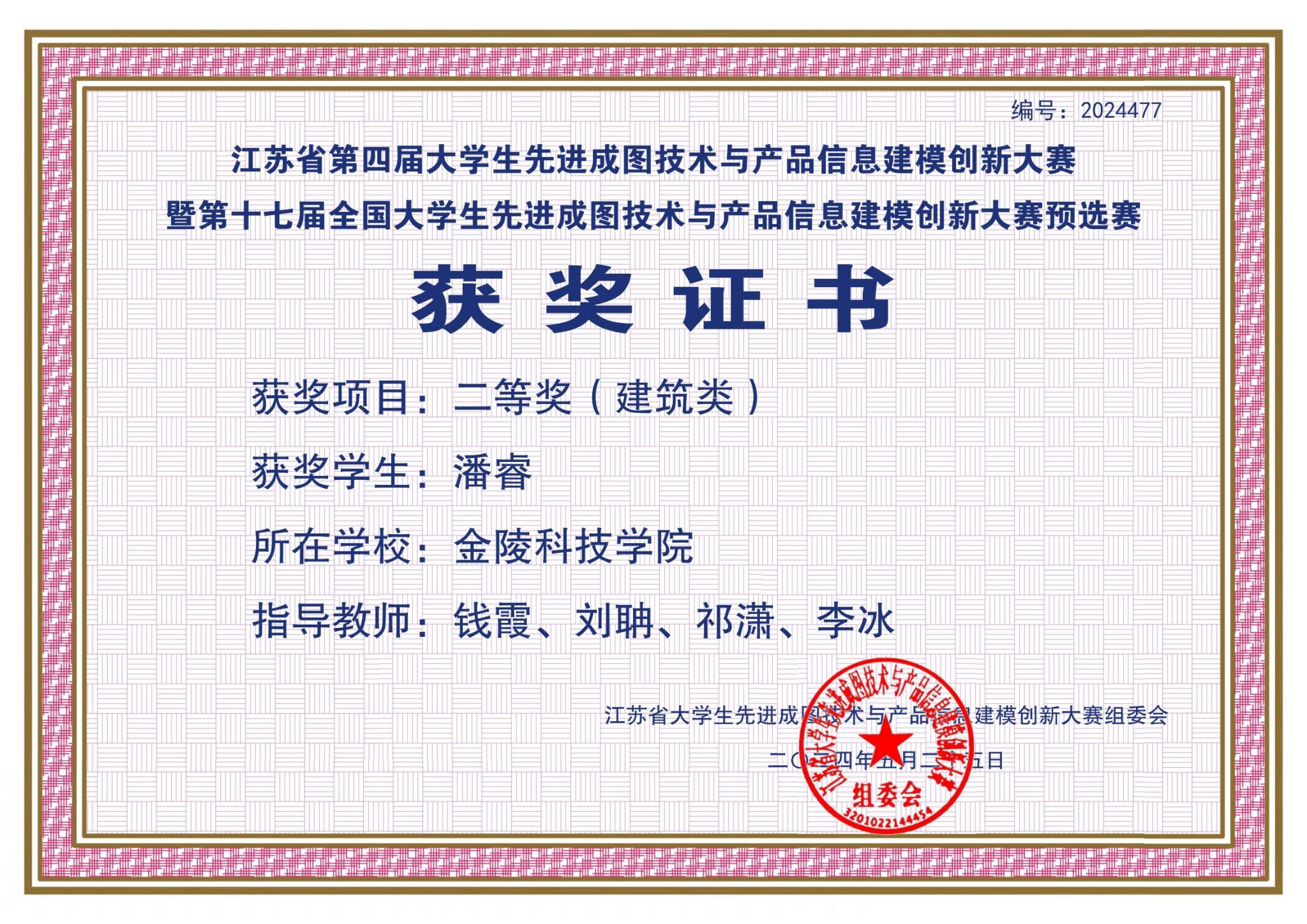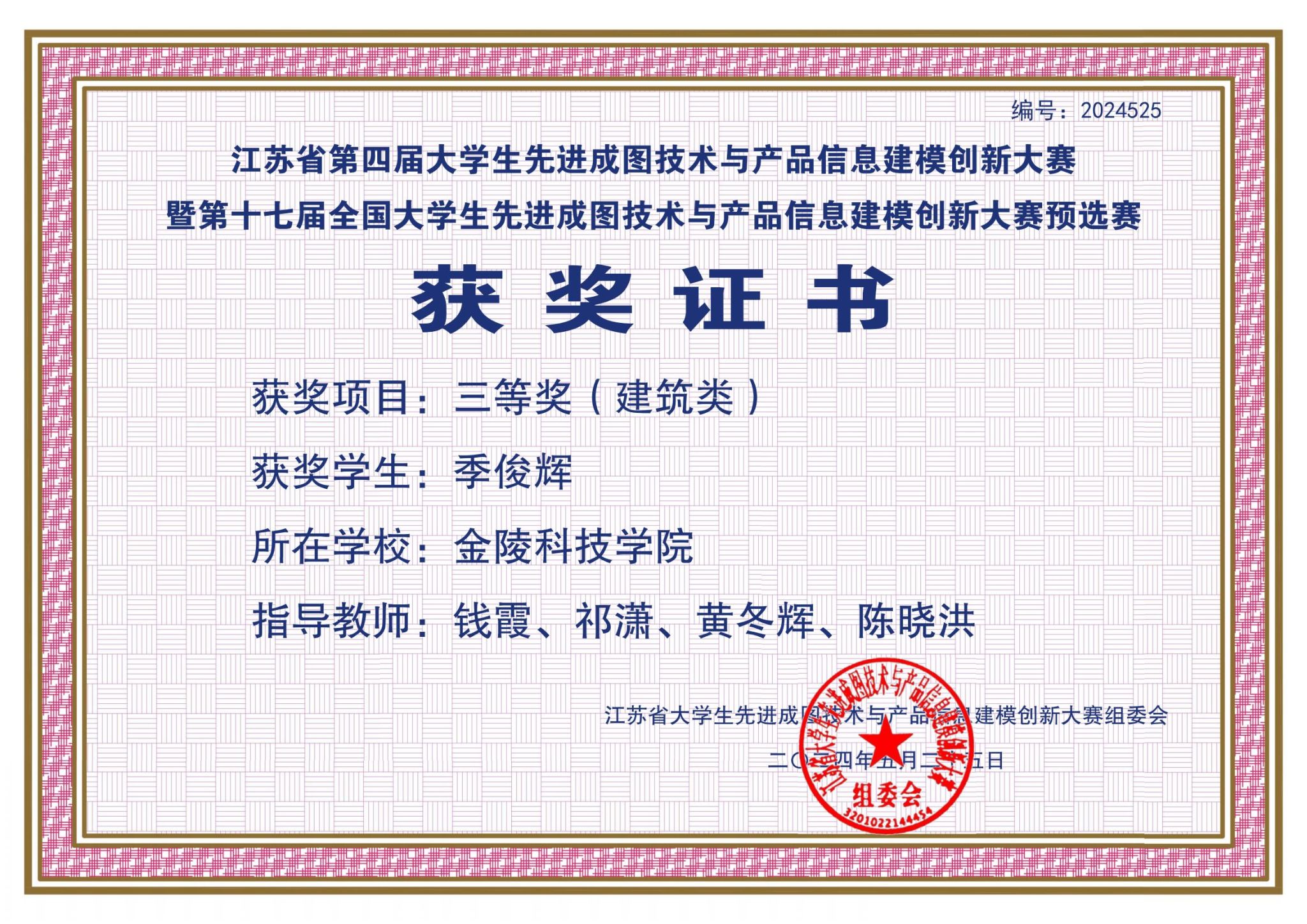 2024年5月25日,江苏省第四届大学生先进成图技术与产品信息建模创新大赛暨第十七届全国大学生先进成图技术与产品信息建模创新大赛成功举办。经过激烈角逐,我院土木工程专业潘睿同学获建筑类个人二等奖,建筑学专业季俊辉同学获建筑类个人三等奖,潘睿、季俊辉、袁芝雯、陶文昊、周祎聪5位同学获得建筑类团体三等奖的好成绩。