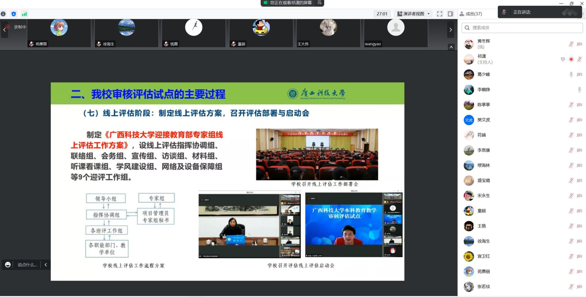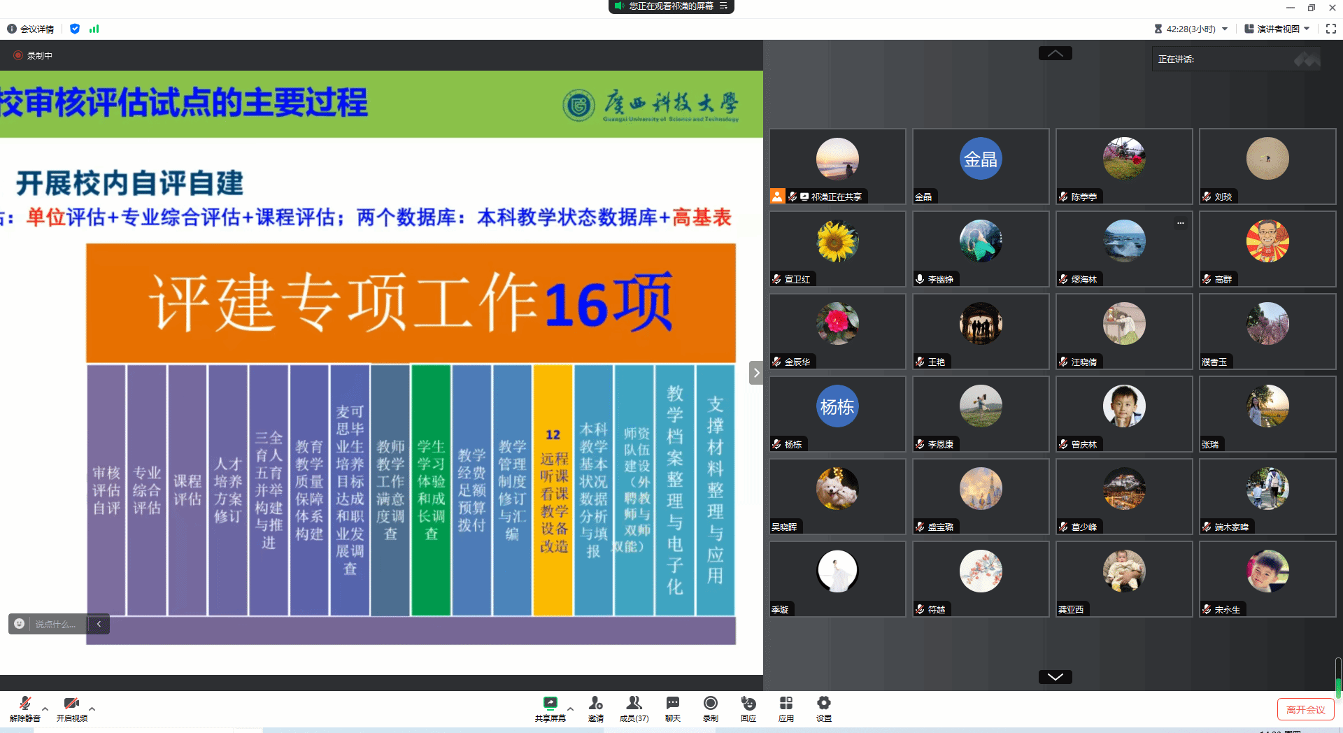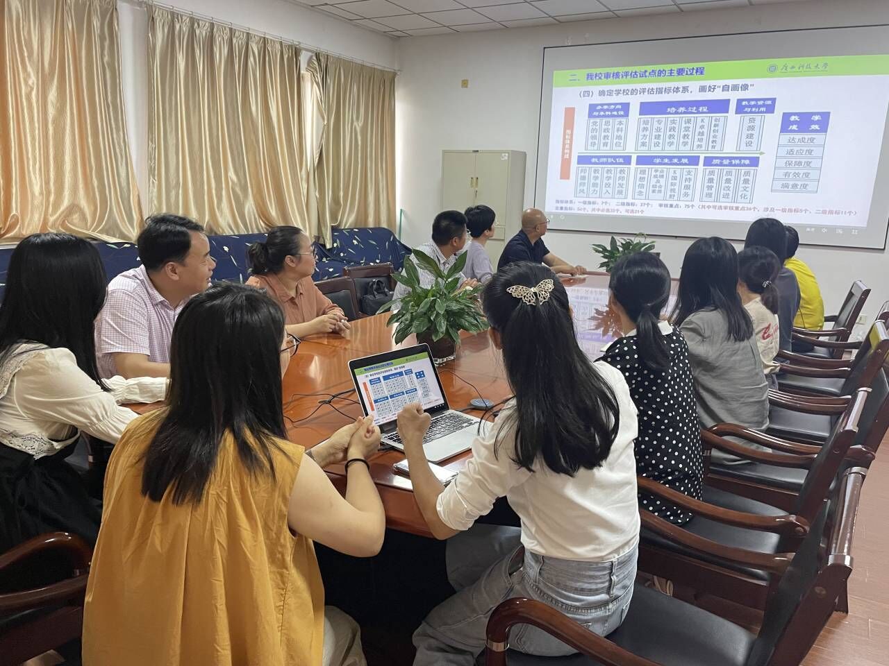 会议邀请了广西科技大学教育评价中心秦福利主任对审核评估整体工作做了全面阐述和说明。主要从全面把握新一轮审核评估的主要精神;立足校情,扎实做好评建工作;评估收获与体会三个方面进行了讲述。具体评建工作包括开展学习培训;做好顶层设计;开展评建工作;填好两个数据库;撰写自评报告,准备案头材料;做好线上、线下评估(迎评)工作等六个方面内容。