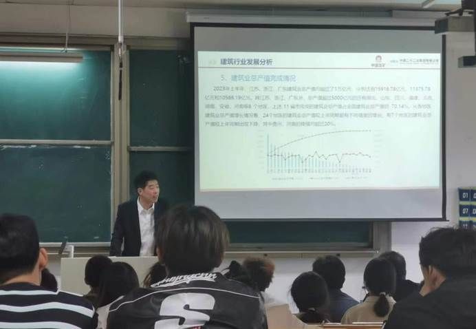 张伟总经理从三个方面展开介绍,首先介绍了建筑行业近年来发展现状,结果表明各个地区的建筑业总产值都有不同程度的增长,依旧是国民经济的支柱产业;其次,从企业发展角度向同学们介绍了建筑企业顺应国家政策发展,加快智能建造和协同发展的同时,企业合同签订额也在同步增长,对专业人才也有更大的需求;最后,张伟总经理以“天平”作为结束语,告诉同学们付出的劳动和获得的报酬是等同的,勉励同学们在享受大学美好生活的同时,也不要忘记坚持学习,奠定扎实的专业基础。