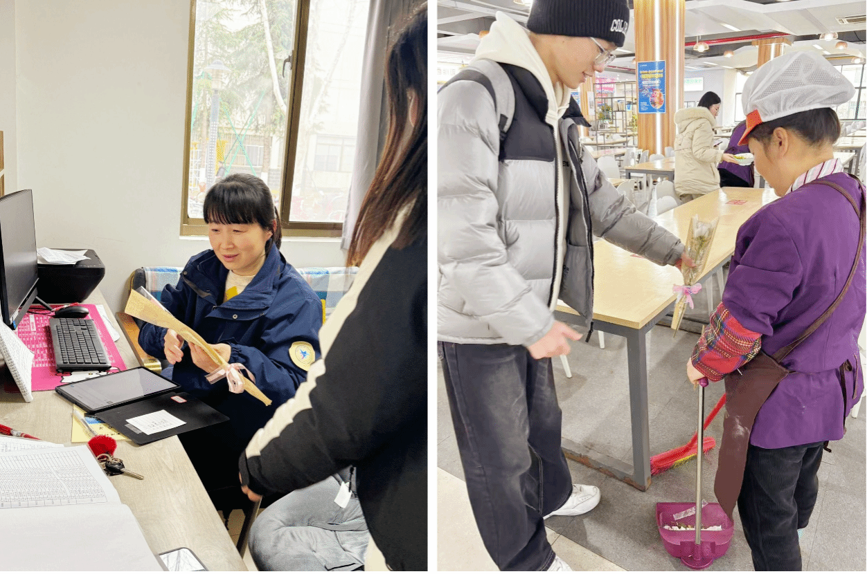 随后,志愿者们将自己的花束赠送给学校各岗位一线员工,向他们致以崇高的敬意。这一举动不仅让一线员工感受到了来自志愿者的温暖和关怀,也进一步弘扬了雷锋精神,传递了正能量。