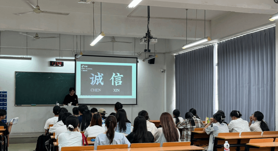 班会上,班长化身“主讲人”,以一段视频切入主题,引发同学们的共鸣,阐述了诚信的重要性。生动的案例和深刻的分析,让学生深刻认识到诚信不仅是我们个人品质的体现,更是走向社会、融入时代的通行证,要时刻保持诚信之心,做到言行一致、表里如一。不仅要具备扎实的专业知识,更要坚守诚信原则,无论是考试、学术研究还是日常行为,都要做到诚实守信。同学们积极讨论,互相分享有关诚信的故事。大家表示,今后会将诚信化作行为准则并以实际行动,做到真诚待人、守信践诺。