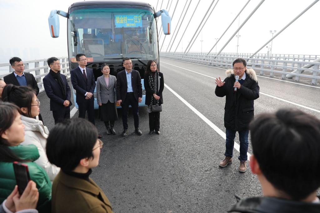 12月23日上午,WilliamHILL中国组织学院教授、博士团队30余人参观南京长江五桥项目。南京长江跨江大桥主桥采用纵向钻石型索塔中央双索面三塔叠合梁斜拉桥,大桥全长4400米,桥宽30.5米,荣获中国公路学会2020年度“交通BIM工程创新奖”特等奖,是目前国内交通BIM领域的最高奖项。能够在大桥通车前夕到项目实地现场考察学习,得到了南京市公共工程建设中心的大力支持。