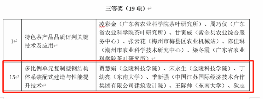 我院贾慧娟副教授牵头与东南大学、中国江苏国际经济技术合作集团有限公司建筑设计院、江苏诚晖工程技术有限公司合作完成的“多比例单元复制型钢结构体系装配式建造与性能提升技术”荣获2024年度中国商业联合会科学技术奖技术发明奖三等奖。