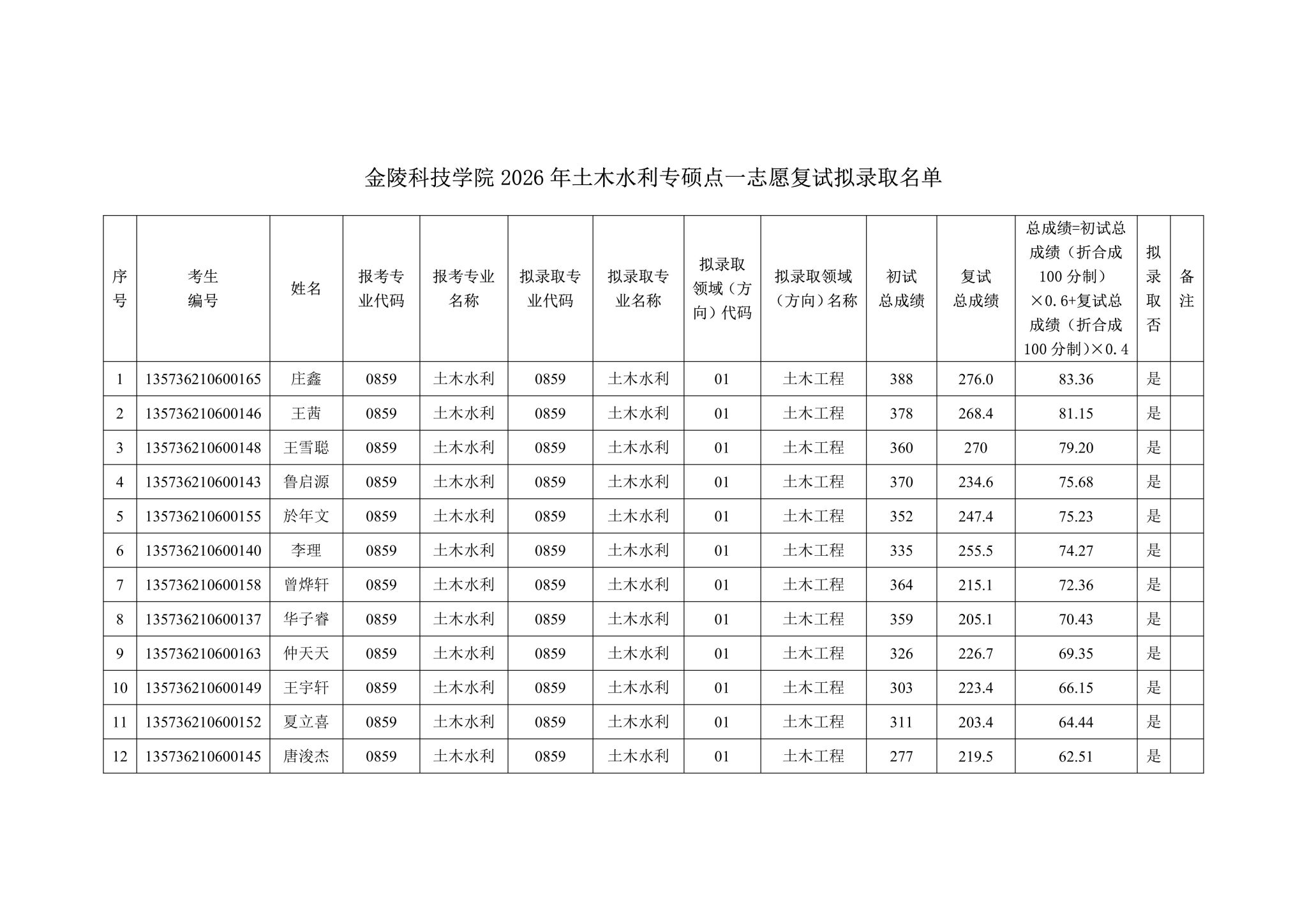 附:williamhill2026年土木水利专硕点一志愿复试拟录取名单