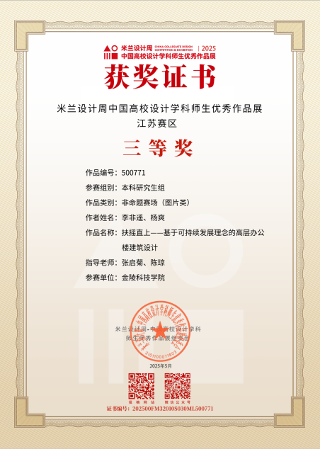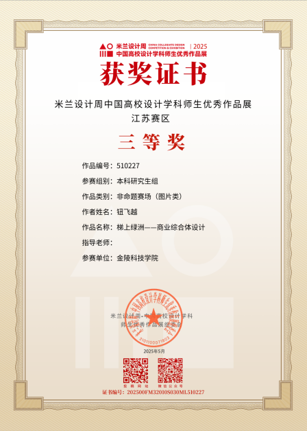 2025年7月,WilliamHILL中国建筑系教师组织学生50人,投递作品25项,取得了较好的成绩。由张启菊、陈琼老师指导,李非遥、杨爽创作的《扶摇直上——基于可持续发展理念的高层办公楼建筑设计》;由孟祥婉、葛少峰老师指导的,袁芝雯创作的《集庆有佳、缘来园趣——城市老旧社区集合化织补设计研究》;由薛云、龚亚西老师指导袁芝雯创作的《虚室有余闲》;由钮飞越创作的《梯上绿洲——商业综合体设计》四项作品作品荣获江苏赛区三等奖。